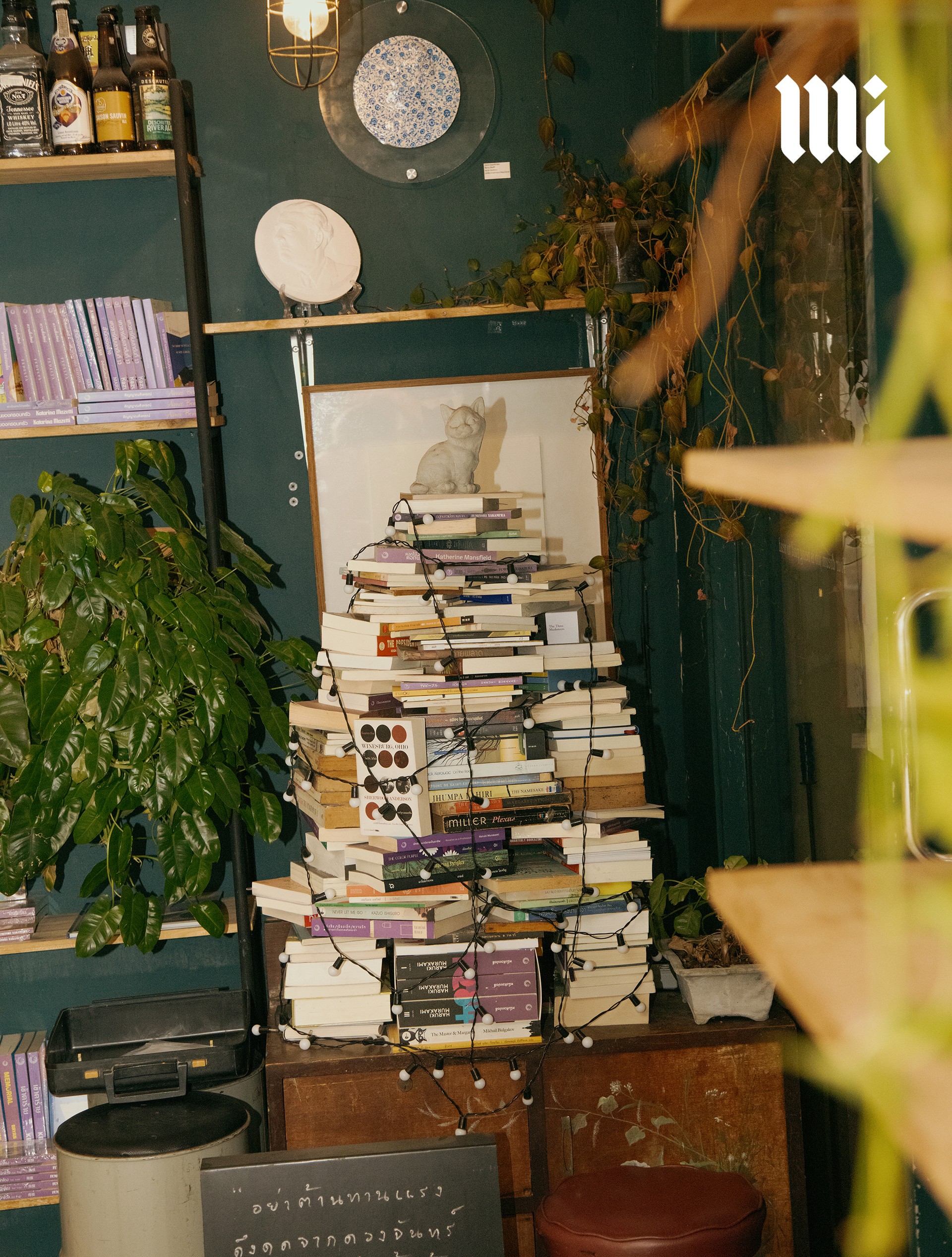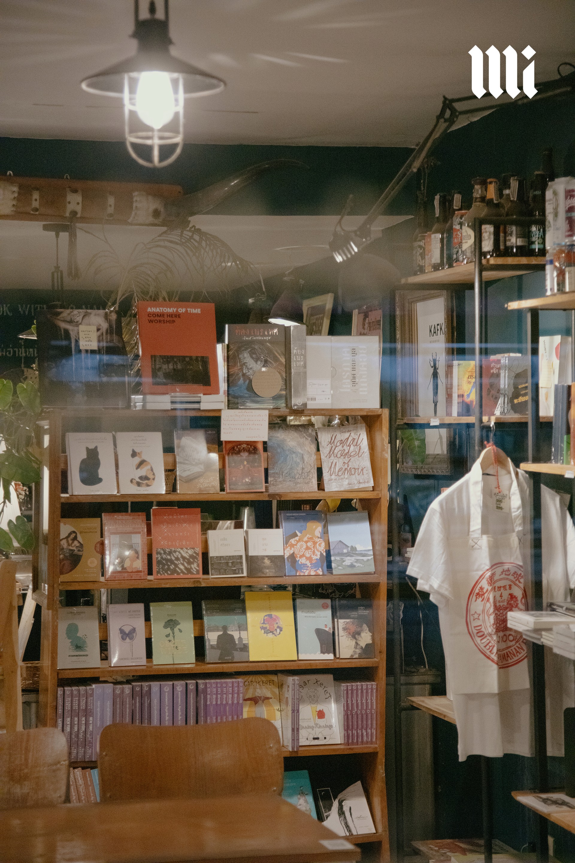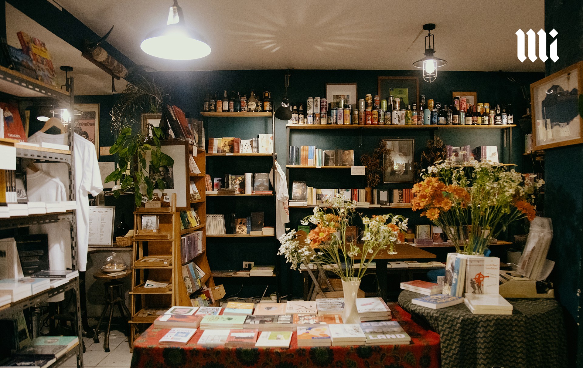 เมื่อก้าวเข้าไปในร้าน เราก็ได้รับการต้อนรับด้วยบรรยากาศเรียบง่ายแต่ผ่อนคลาย เคล้าด้วยเสียงเพลงคูลๆ ที่เปิดในระดับเสียงที่คุ้นชินยามใช้บริการในคาเฟ่ ไม่ได้เงียบสงัดดังห้องสมุด เชลฟ์หนังสือและโต๊ะวางหนังสือกระจายไปเกือบทั่วพื้นที่ของร้าน อัดแน่นไปด้วยวรรณกรรมแปลทั้งแนวคลาสสิคและการเมือง หนังสือแนวปรัชญา อุดมการณ์ ศิลปวัฒนธรรม ซับคัลเจอร์ต่างๆ รวมไปถึงพ็อกเก็ตบุ๊กแนวบันทึกความทรงจำหรือบันทึกการเดินทางต่างๆ แซมด้วยต้นไม้และดอกไม้เพิ่มความสบายตา นอกจากนี้ยังมีบาร์เครื่องดื่มที่มีทั้งกาแฟ ชา โกโก้ โซดา และแอลกอฮอล์ พร้อมขนมอบต่างๆ ซ่อนอยู่ตรงมุมด้านในของร้าน ที่นี่จึงเหมาะมากที่จะเข้ามาหลบร้อนหลีกหนีความวุ่นวายของเมือง เพื่อแวะนั่งจิบเครื่องดื่มพร้อมผจญภัยสู่โลกใหม่ๆ ผ่านตัวหนังสือ