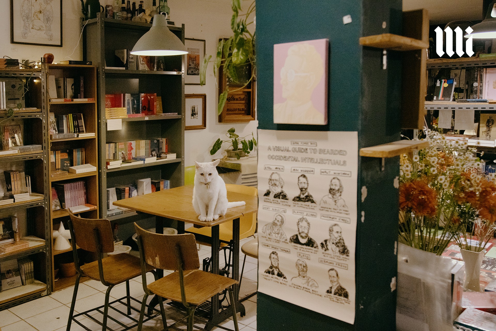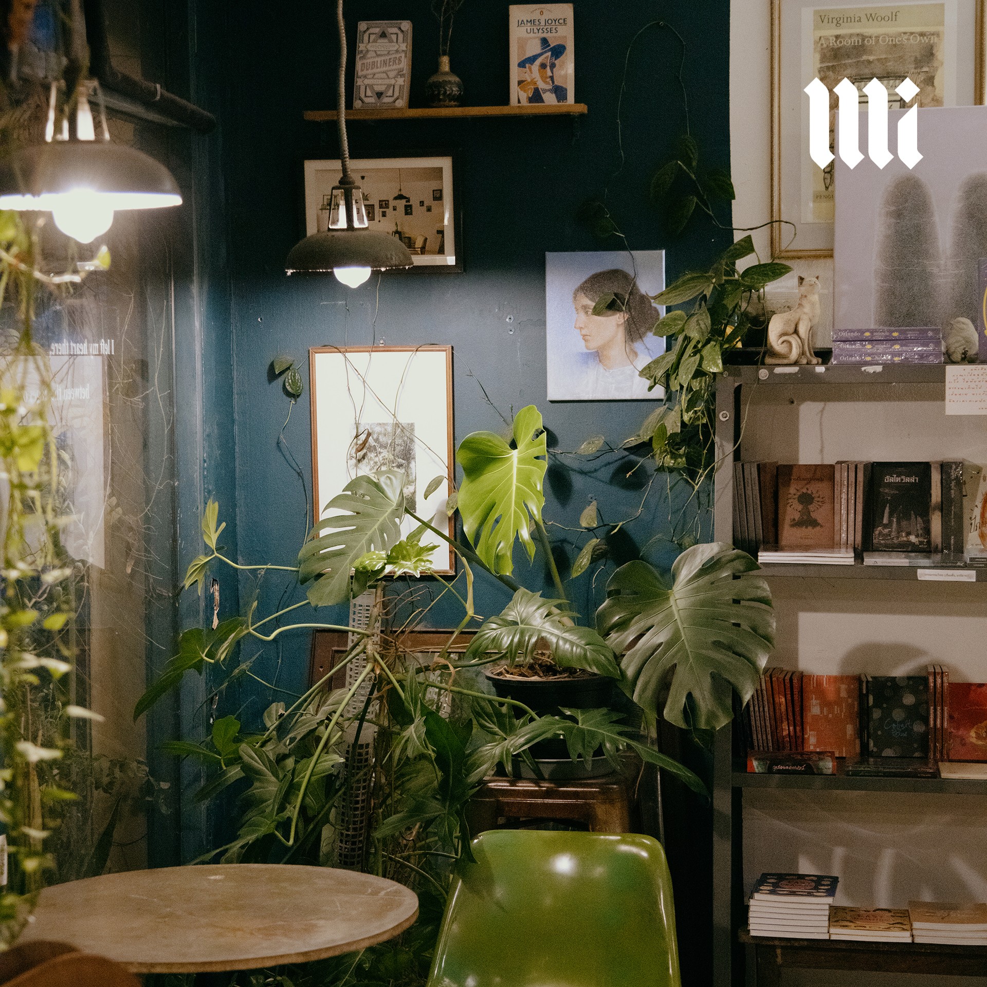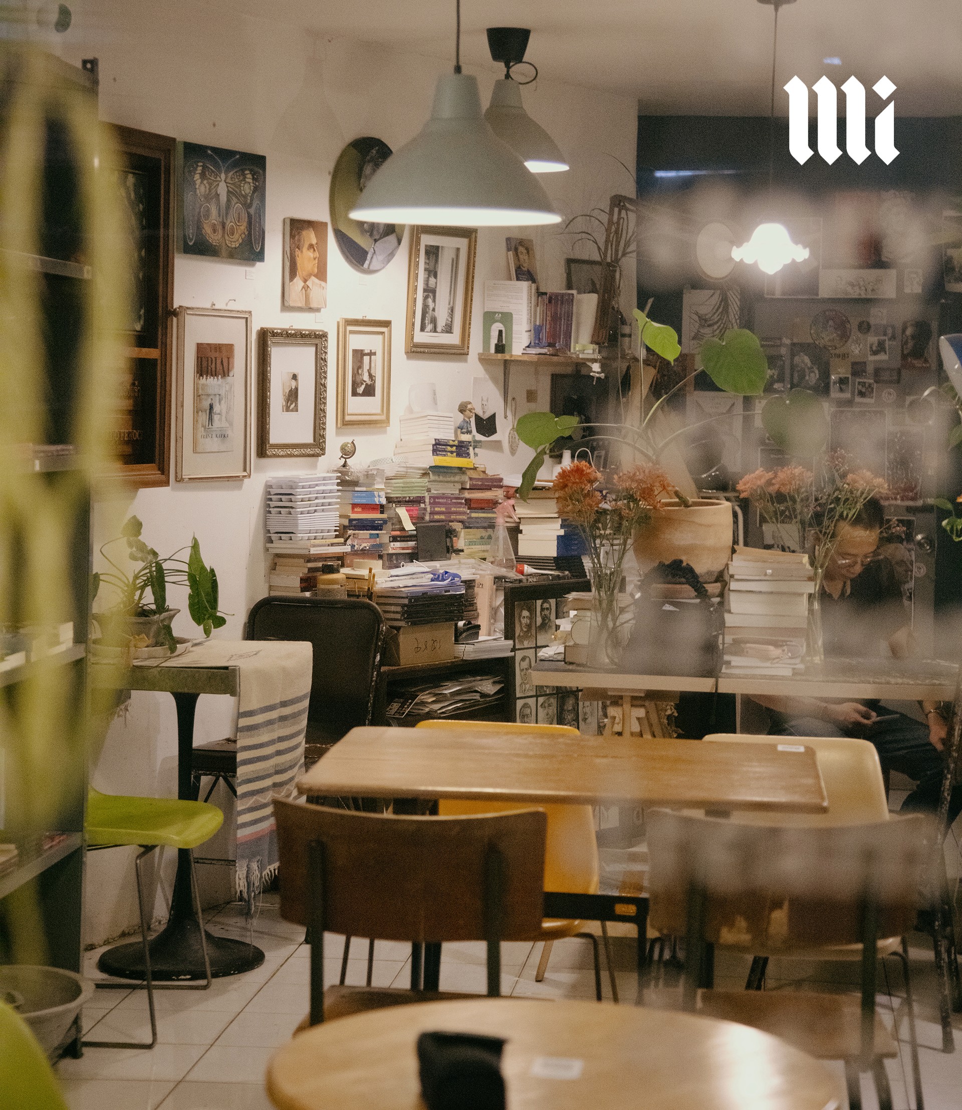 เมื่อก้าวเข้าไปในร้าน เราก็ได้รับการต้อนรับด้วยบรรยากาศเรียบง่ายแต่ผ่อนคลาย เคล้าด้วยเสียงเพลงคูลๆ ที่เปิดในระดับเสียงที่คุ้นชินยามใช้บริการในคาเฟ่ ไม่ได้เงียบสงัดดังห้องสมุด เชลฟ์หนังสือและโต๊ะวางหนังสือกระจายไปเกือบทั่วพื้นที่ของร้าน อัดแน่นไปด้วยวรรณกรรมแปลทั้งแนวคลาสสิคและการเมือง หนังสือแนวปรัชญา อุดมการณ์ ศิลปวัฒนธรรม ซับคัลเจอร์ต่างๆ รวมไปถึงพ็อกเก็ตบุ๊กแนวบันทึกความทรงจำหรือบันทึกการเดินทางต่างๆ แซมด้วยต้นไม้และดอกไม้เพิ่มความสบายตา นอกจากนี้ยังมีบาร์เครื่องดื่มที่มีทั้งกาแฟ ชา โกโก้ โซดา และแอลกอฮอล์ พร้อมขนมอบต่างๆ ซ่อนอยู่ตรงมุมด้านในของร้าน ที่นี่จึงเหมาะมากที่จะเข้ามาหลบร้อนหลีกหนีความวุ่นวายของเมือง เพื่อแวะนั่งจิบเครื่องดื่มพร้อมผจญภัยสู่โลกใหม่ๆ ผ่านตัวหนังสือ