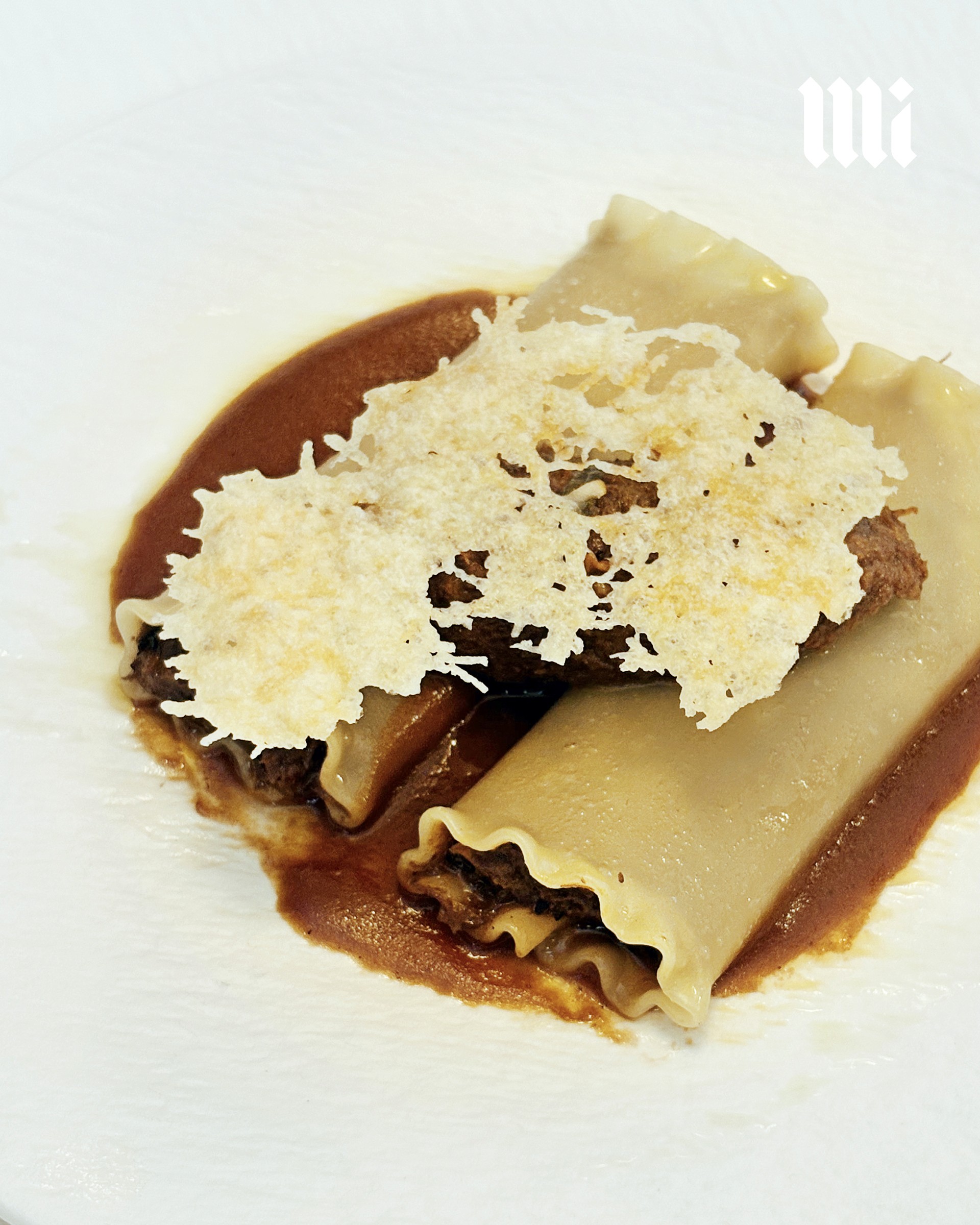 เนื้อวัวไอริชคุณภาพเยี่ยมนำมาตุ๋นแบบ slow cook ด้วยไฟอ่อนเป็นเวลานานจนเปื่อยละมุนและฉีกเป็นฝอย ผสมผสานกับซอส ragu ที่เข้มข้นสอดใส้ในแผ่นพาสต้า Riccia ช่วยให้ซอสเกาะติดได้ดีเยี่ยม ทานคู่กับชีสพาร์มิเจียโน่ที่วางมาเป็นแผ่นกรอบ ให้รสเค็มหวานที่เข้ากันอย่างลงตัว เพิ่มมิติของเนื้อสัมผัสให้สนุกยิ่งขึ้น