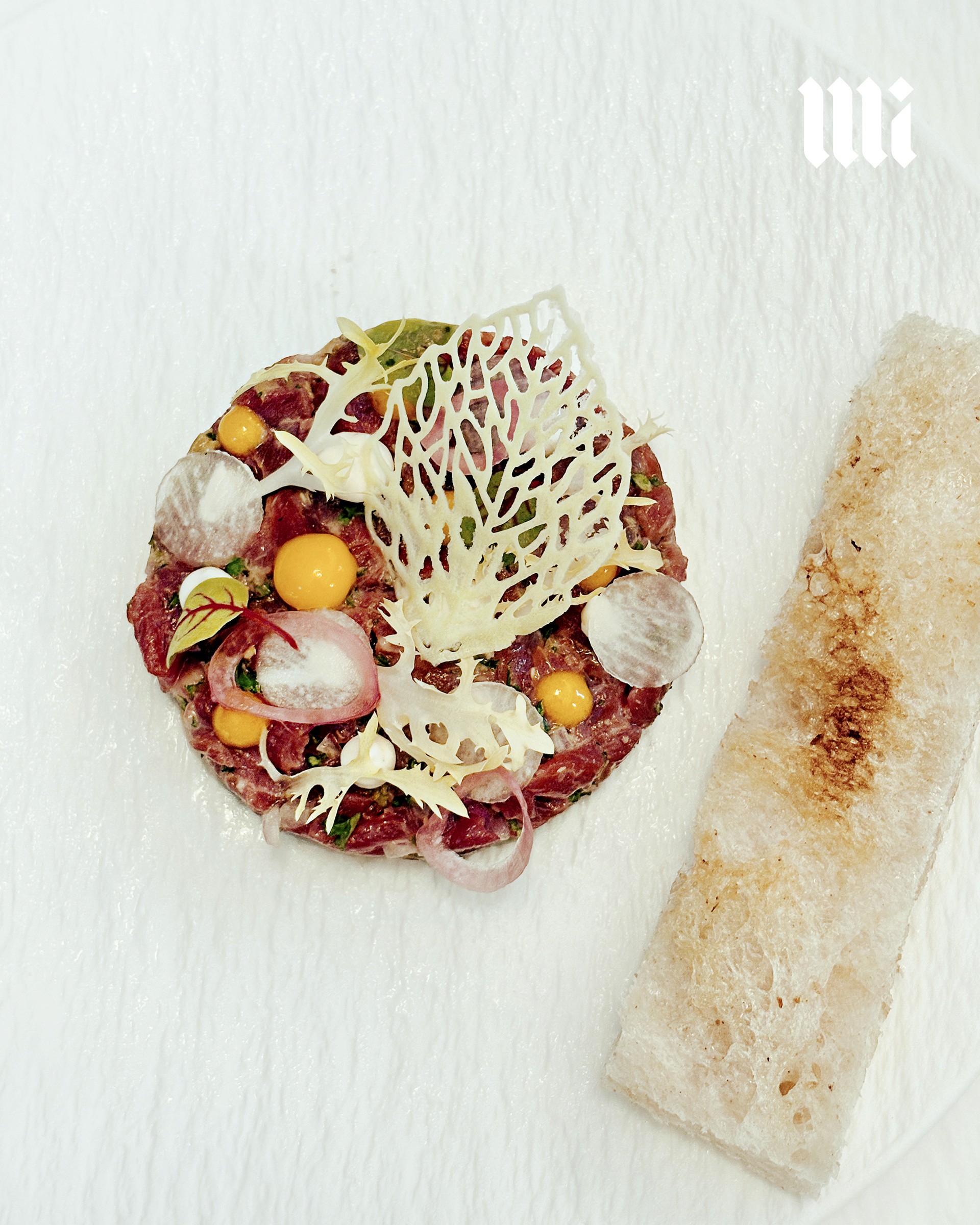เนื้อทาร์ทาร์เสิร์ฟพร้อมกับ horseradish ครีม ซอสไข่แดงมัสตาร์ด และหอมแดงดอง – เนื้อสันในดิบสับละเอียด เนื้อสัมผัสนุ่มละมุน พร้อมกลิ่นหอมเฉพาะตัวจากการเลี้ยงด้วยหญ้าสด ไม่มีกลิ่นคาวหรือกลิ่นแปลกใดๆ เนื่องจากวัวได้รับการเลี้ยงดูอย่างเป็นธรรมชาติ พร้อมรสชาติซอสที่กลมกล่อม ซอสไข่แดงมัสตาร์ดที่ครีมมี่และเข้มข้น และหอมแดงดองที่ให้ความเปรี้ยวกรอบ ช่วยสร้างสมดุลรสชาติในจานนี้